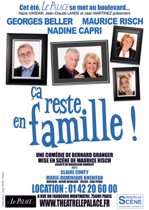 | Ca reste en Famille ! de Bernard GRANGER Avec Georges BELLER, Maurice RISCH, Nadine CAPRI, Claire Conty et Marie-Dominique KHENIFAR ex cantatrice, Barbara Savagnac a du reconvertir sa maison en gîte pour faire vivre sa famille, avec l'aide de Sonia, cuisinière écologiste radicale. Hélas, les affaires ne sont pas reluisantes et les huissiers se font pressants à sa porte. Le jour où Lilou, sa fille, décide de lui présenter l'homme qu'elle souhaite épouser, Barbara, stupéfaite, se retrouve face à face au véritable sosie de son défunt mari… disparu depuis 20 ans ! Mais lorsqu'un notaire veut remettre une somme colossale en mains propres à feu son mari, l'idée de faire ressusciter ce dernier commence à germer… |
